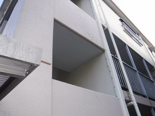 施工内容は、防鳥ネットの取り付けと、フン害が激しい共用部の清掃や消毒などです。
